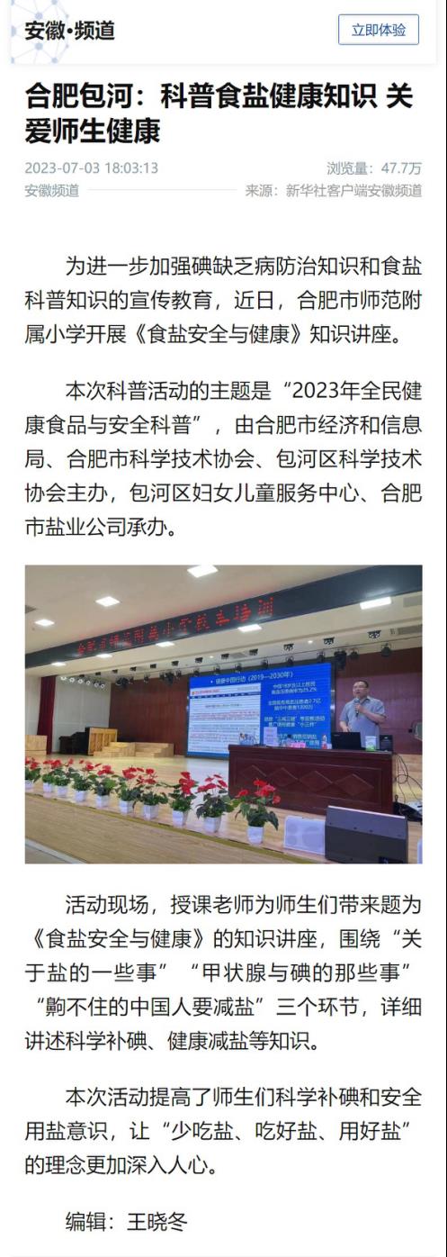 為切實(shí)做好黨的二十大精神宣傳貫徹工作,在習(xí)近平新時(shí)代中國(guó)特色社會(huì)主義思想指引下 ,進(jìn)一步樹牢以人民健康為中心的發(fā)展思想,合肥鹽業(yè)在合肥市師范附屬小學(xué)開展食鹽科普活動(dòng),為全校200余名師生普及科學(xué)補(bǔ)碘、健康減鹽知識(shí),關(guān)愛師生健康,推廣中鹽低鈉鹽,助力健康中國(guó)建設(shè),食鹽健康科普活動(dòng)得到新華社客戶端安徽頻道關(guān)注報(bào)道,截至發(fā)稿日總瀏覽量達(dá)47.7萬(wàn)次。